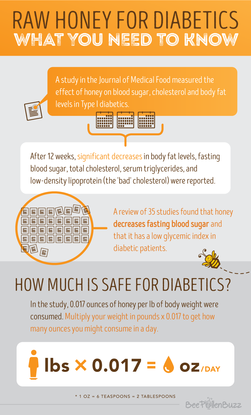 Twenty patients of both sexes aged 4 -18 years with type 1 diabetes participated in the study. The participants were given honey in a dose of 0.5 mL/kg body weight per day for 12 weeks. This would equate to less than a quarter cup of honey per day in a 150 pound person.